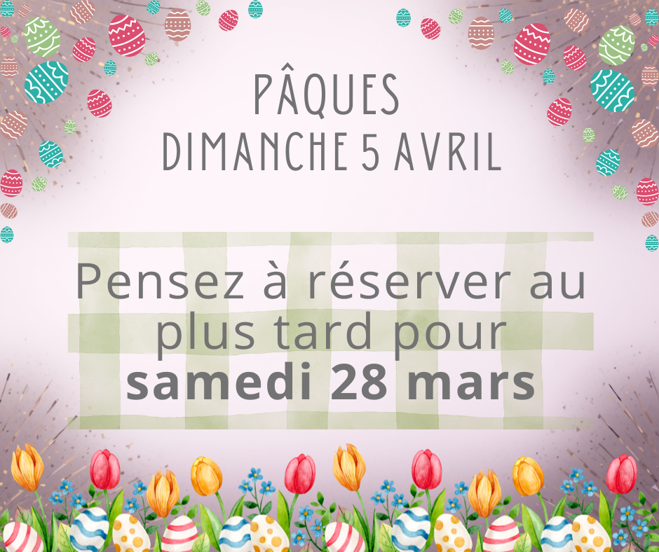 Les fêtes de Pâques approchent Nous prenons vos commandes jusqu’au samedi 28 mars (dans la limite des quantités disponibles)